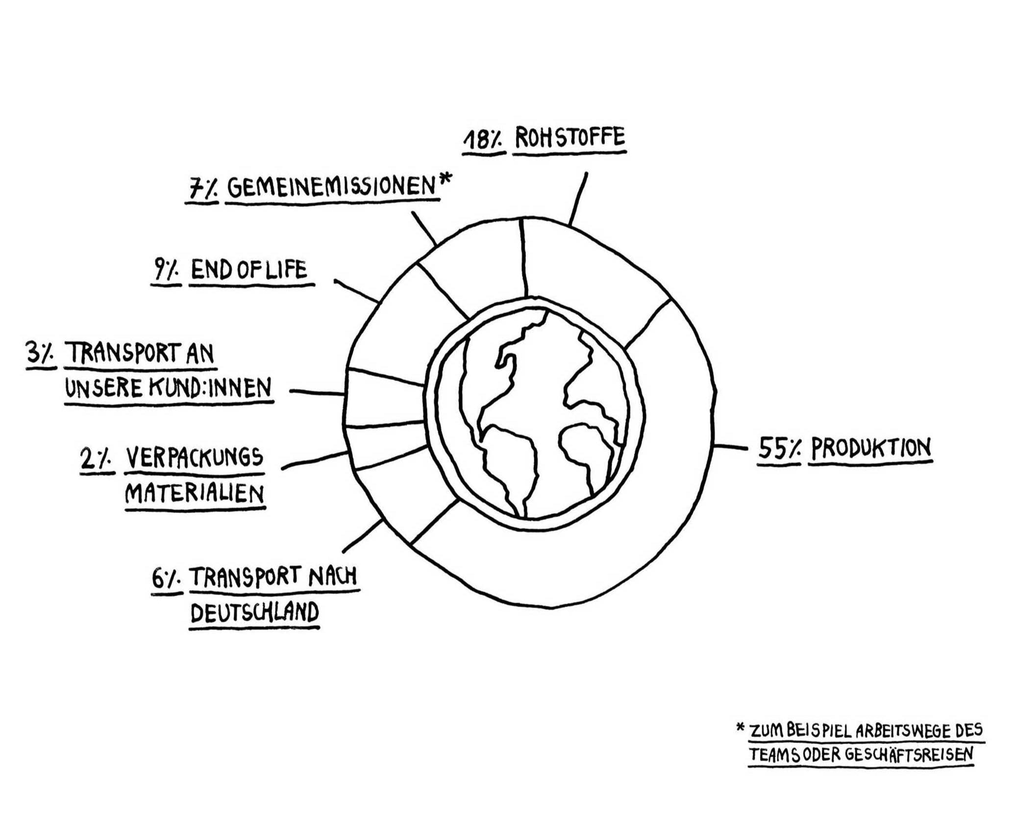 We mean it when we write that we offset 100% of our emissions. This does not just mean the emissions that we have consumed here at our Cologne site, but all the emissions that we, as the saying goes, have to take responsibility for. This includes, among other things, the emissions of our producers and the entire logistics as well as the CO₂ emissions that would have to be spent to dispose of our products.