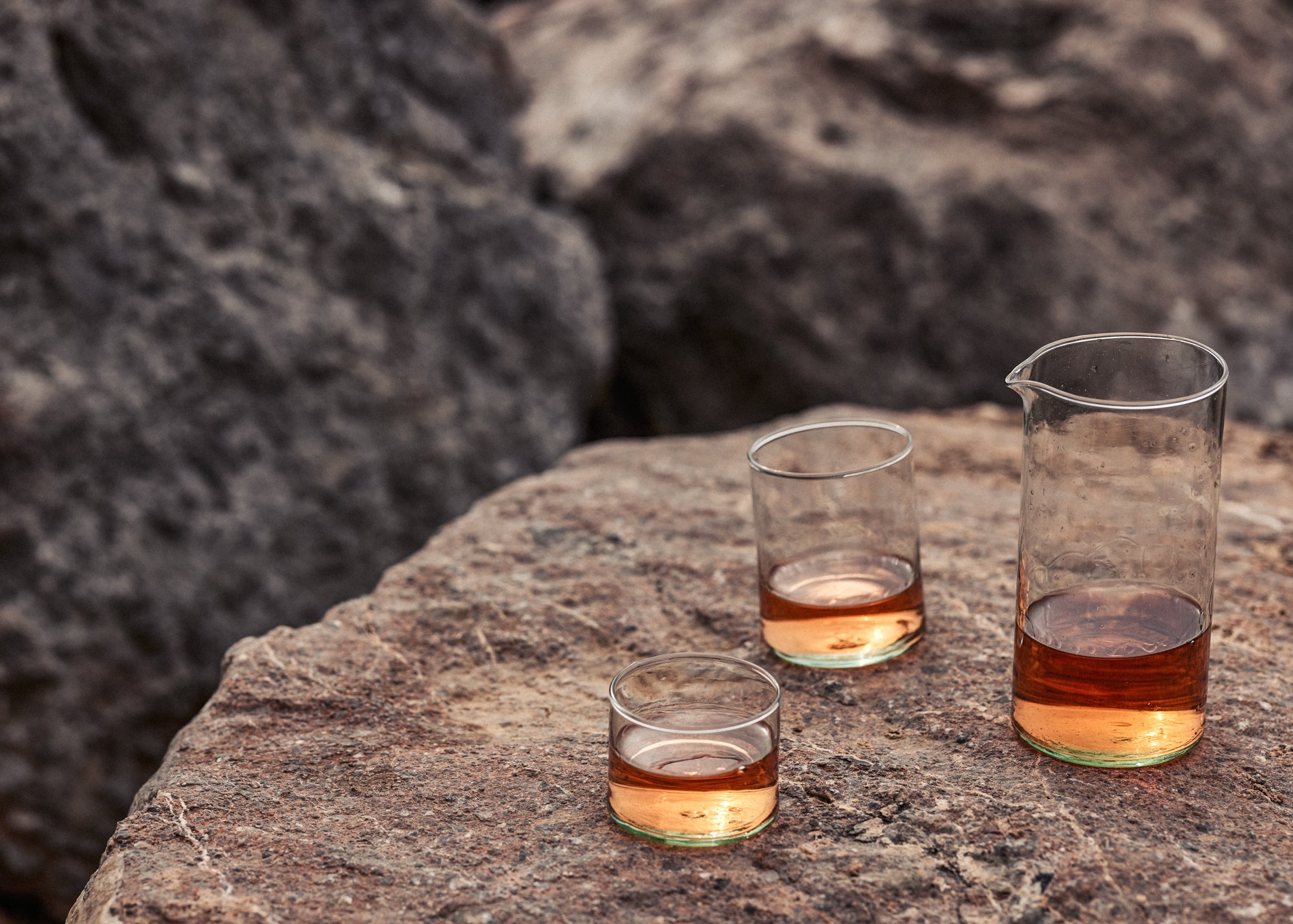 Unsere Trinkgläser und Karaffen bestehen zu 80 % aus recyceltem Glas und werden in einer Familienmanufaktur in Portugal mundgeblasen. Da Glas aus natürlichen Materialien wie etwa Sand und Kalk besteht, eignet es sich ideal zum Recyceln. Das Einschmelzen und die Neuformung von Glas gehört dabei zu einem der ältesten Recyclingprozesse unserer Kulturgeschichte.
