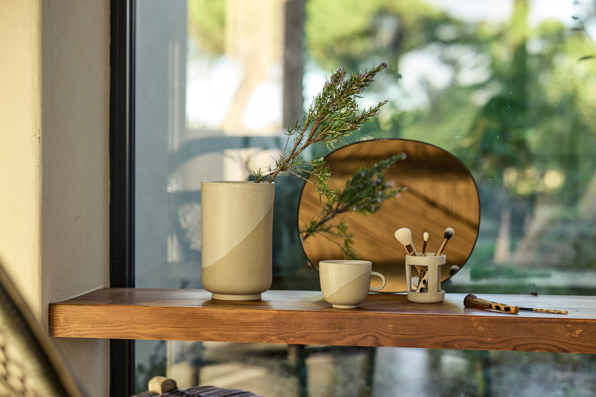 Aus der Zusammenarbeit mit JACKS entstehen drei Keramikstücke, die die tägliche Pflege zum Ritual machen: ein großzügiger Becher für den ersten Kaffee oder Tee, eine Vase auf kleinem Sockel für Blumen und Zweige und ein Pinselhalter mit ausgearbeiteten Aussparungen für Make-up-Brushes. Gefertigt aus Steinzeug, fair produziert in Portugal und von Hand glasiert, verbinden sie ruhiges Design mit Funktion – spülmaschinengeeignet, langlebig und harmonisch kombinierbar mit unserer Keramik.