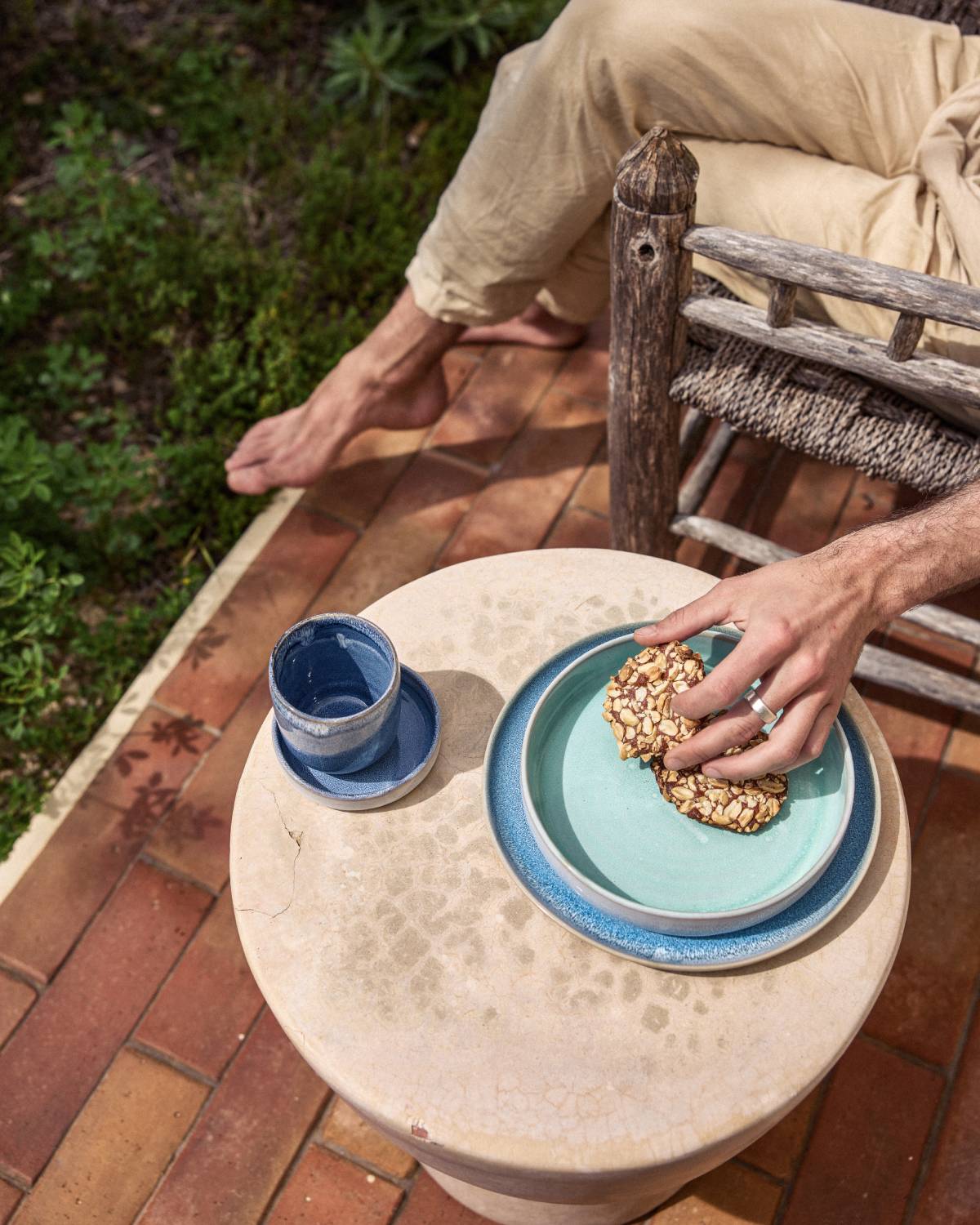 Die Kollektion gibt es in vielen, meist reaktiven Glasuren, die sich konsequent miteinander kombinieren lassen. So entsteht ein Tischbild, das bleibt – Teller, Schalen und Becher in harmonischen Farbspielen, handgemacht in Portugal.